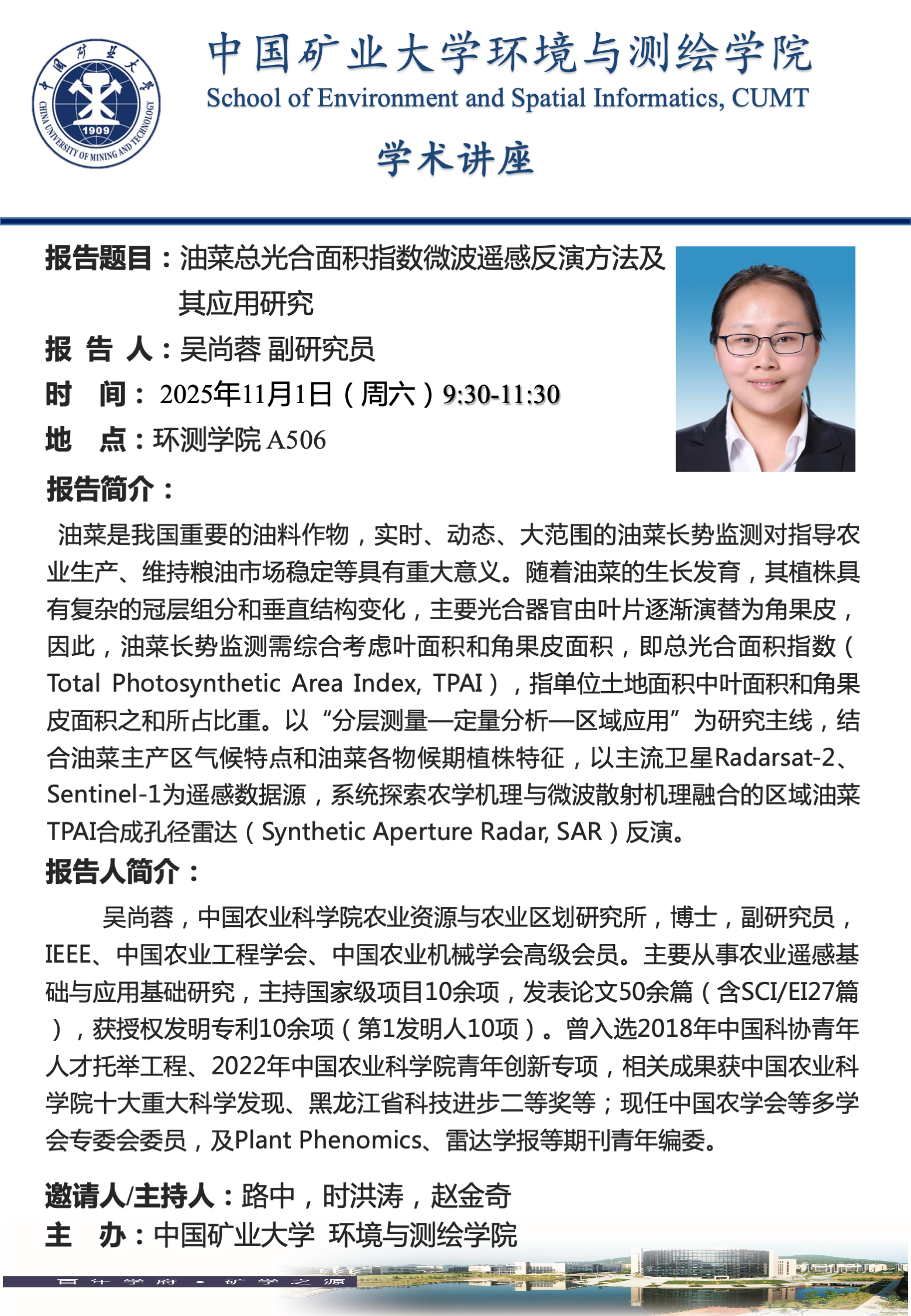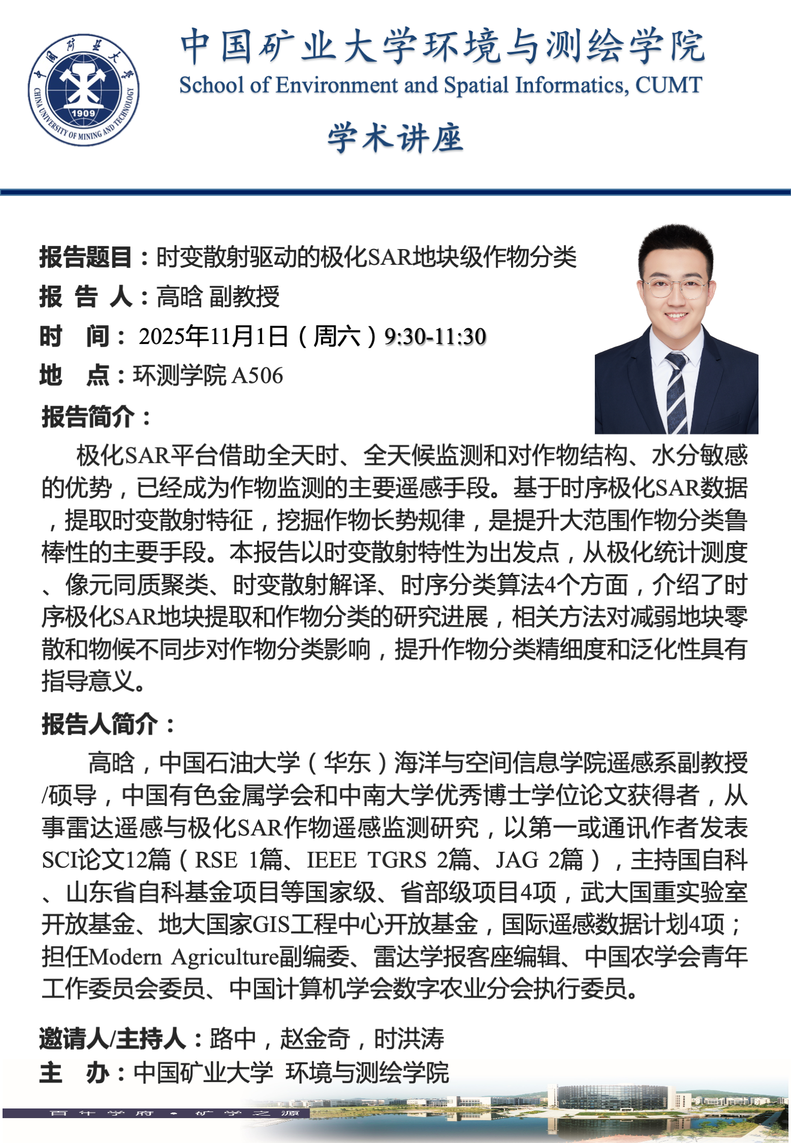 报告1:油菜总光合面积指数微波遥感反演方法及其研究应用;报告2:时变散射驱动的极化SAR地块级作物分类